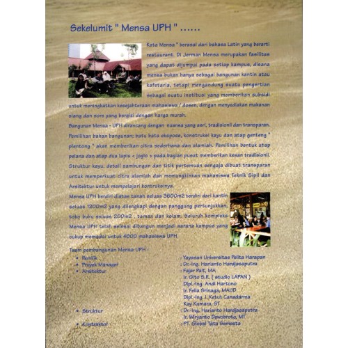 Bangunan Mensa-UPH dirancang dengan nuansa yang asri, tradisionil dan transparan. Pemilihan bahan bangunan; batu bata ekspose, konstruksi kayu dan atap genteng plentong akan memberikan citra sederhana dan alamiah. Pemilihan bentuk atap pelana dan atap dua lapis <Joglo> pada bagian pusat memberikan kesan tradisionil. Struktur kayu, detail sambungan dan titik pertemuan sengaja dibuat transparan untuk memperkuat citra alamiah dan memungkinkan mahasiswa Teknik Sipil dan Arsitektur untuk mempelajari konstruksinya.